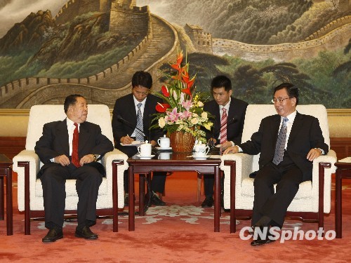 9月2日,中共中央政治局常委、中央纪委书记贺国强在北京人民大会堂会见老挝建国阵线中央委员会主席西沙瓦·乔本潘。中新社发 盛佳鹏 摄