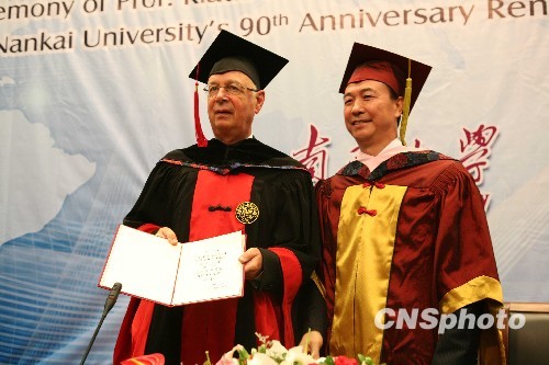 9月8日,世界经济论坛(达沃斯论坛)主席克劳斯·施瓦布接过南开大学名誉博士学位证书,成为该校继国际数学大师陈省身、物理学家吴大猷等之后的第8位名誉博士。中新社发 任永华 摄