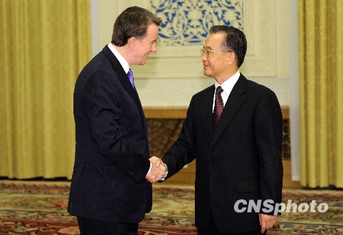 9月9日,中国国务院总理温家宝在北京人民大会堂会见了英国首席大臣、商业创新和技能大臣兼枢密院院长彼得·曼德尔森一行。中新社发 廖攀 摄