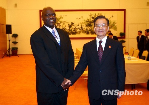 9月10日,中国总理温家宝在大连会见了出席世界经济论坛第三届领军者年会(夏季达沃斯)的津巴布韦副总理穆坦巴拉。中新社发 杜洋 摄