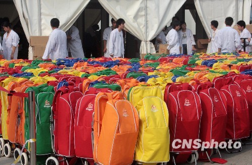 9月17日,在北京全国农业展览馆广场,国庆游行相关工作人员,正对所有参加明天国庆游行演练的演员们所用道具包开始安检。通过安检的道具包,将统一签封。中新社发 吴芒子 摄