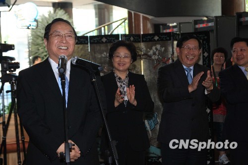 9月19日,“第五届世界华文传媒论坛”在上海开幕。会前,中央政治局委员、上海市委书记俞正声等领导与海外媒体代表合影并希望海外媒体明年多到上海采访世博会。中新社发 潘索菲 摄