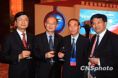 九月十九日晚,第五届世界华文传媒论坛欢迎晚宴在上海华亭宾馆举行。国务院侨务办公室副主任赵阳(左二)、中国新闻社社长刘北宪(左)、中国新闻社总编辑章新新(右)与《澳门日报》常务副总编辑黎胜培在欢迎晚宴上合影。中新社发 汤彦俊 摄