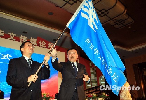 9月20日下午,第五届世界华文传媒论坛在上海闭幕,并宣布两年后在重庆举行第六届世界华文传媒论坛。上海市副市长唐登杰(右)向重庆市副市长周慕冰移交论坛会旗。中新社发 潘索菲 摄