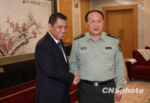 9月25日,中国国务委员兼国防部长梁光烈在北京会见了来访的文莱国防部副部长亚斯敏一行。中新社发 杜洋 摄