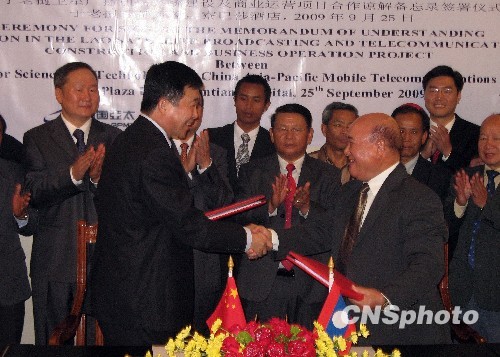 9月25日,中国与老挝在老挝首都万象共同签署“老挝卫星广播通信系统建设及商业运营项目谅解备忘录”,此举将实现中国向东盟国家整星出口零的突破。 中国运载火箭技术研究院所属中国亚太移动通信卫星有限责任公司董事长梁小虹(左)、老挝总理府科学与技术署部长本滇·披沙迈分别代表中老双方签署协议。中新社发 张千山 摄