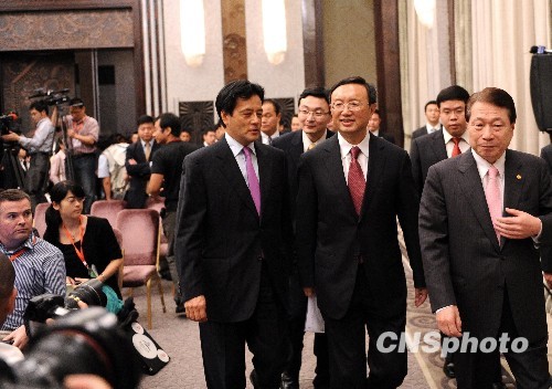 9月28日,中国外交部长杨洁篪、日本外务大臣冈田克也、韩国外交通商部长官柳明桓(右一)在三方会议后共同会见记者。当日,第三次中日韩外长会在上海举行。中新社发 廖攀 摄