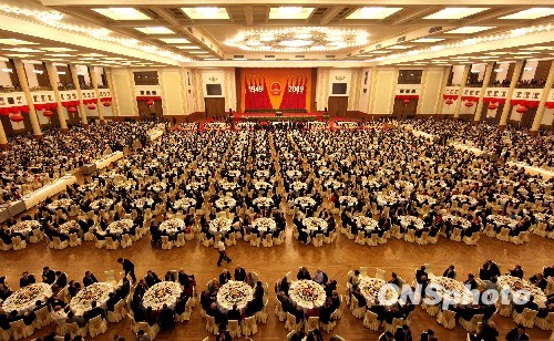 2009年9月30日晚,庆祝中华人民共和国成立60周年招待会在北京人民大会堂举行。中新社发 张宇 摄