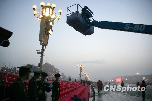 图为工作人员在大典开始前做最后的准备工作。中新社发 刘震 摄
