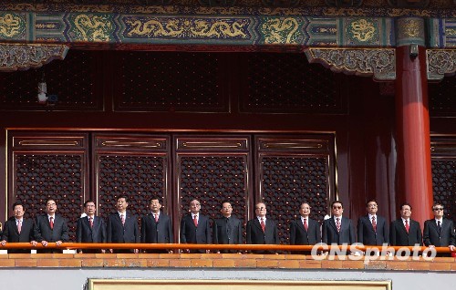 10月1日,中华人民共和国成立60周年庆祝大会在北京天安门广场隆重举行,胡锦涛等党和国家领导人出席。中新社发 杜洋 摄