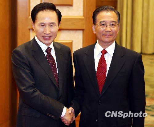 10月10日下午,中国总理温家宝在北京人民大会堂与出席第二次中日韩领导人会议的韩国总统李明博举行小范围会谈。中新社发 任晨鸣 摄