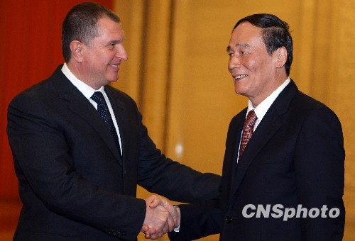 10月11日下午,中国副总理王岐山在北京人民大会堂与俄罗斯副总理谢钦就能源合作等议题会谈。中新社发 任晨鸣 摄