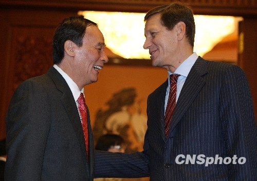 10月12日上午,中国副总理王岐山在北京人民大会堂与主管金融工作的俄罗斯联邦政府副总理亚历山大·德米特里耶维奇·茹科夫会谈。茹科夫1978年毕业于莫斯科国立罗蒙诺索夫大学经济系经济数学专业,1991年获哈佛大学毕业证书,是货币、税务和海关法专家。中新社发 任晨鸣 摄