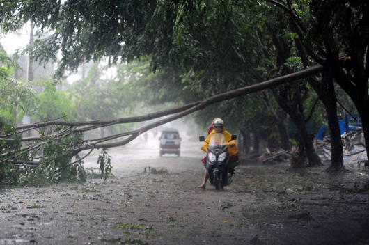 图为2009年10月12日,海南琼海市区大树被狂风刮断。今年第17号热带风暴“芭玛”几度死而复生后卷土重来,目前正以9级风力(23米每秒)风速正面袭击海南琼海市,从10月11日晚十点起,琼海暴雨倾盆狂风肆虐。蒙钟德/CFP
