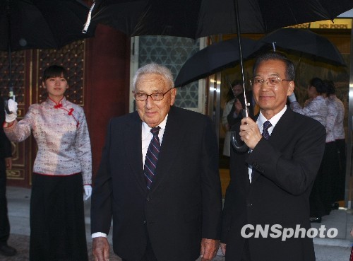 10月12日,中国国务院总理温家宝在北京中南海紫光阁会见出席中美“二轨”高层对话的美方主席、美国前国务卿基辛格、舒尔茨、前国防部长佩里、前财政部长鲁宾等美方代表。图为会见结束后温家宝雨中撑伞送基辛格。中新社发 盛佳鹏 摄