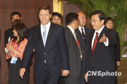 10月13日,第四届中俄经济工商界高峰论坛在北京钓鱼台国宾馆举行,本届论坛由中国商务部与俄罗斯经济发展部共同主办,论坛以“应对危机,面向未来”为主题,深入探讨国际金融危机背景下中俄经贸合作发展面临的机遇和挑战,并提出进一步发展两国务实合作的建议和思路。参加本届论坛的中俄双方代表近800人,主要来自两国政府部门、有关地方及企业界。中国国务院副总理张德江和俄罗斯政府副总理茹科夫出席开幕式并发表主旨演讲。中新社发 盛佳鹏 摄