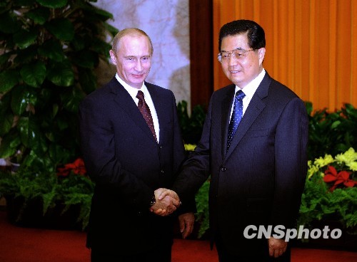 10月14日,中国国家主席胡锦涛欢迎俄罗斯总理普京。当日,胡锦涛在北京人民大会堂集体会见出席上海合作组织总理会议的成员国总理。中新社发 廖攀 摄