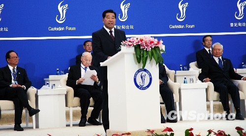 10月16日,首届曹妃甸论坛在河北唐山开幕,中共中央政治局常委、全国政协主席贾庆林、新西兰前总理珍妮·希普莉、英国前副首相约翰·普雷斯科特等中外政要出席论坛。图为贾庆林做主旨演讲。中新社发 翟羽佳 摄