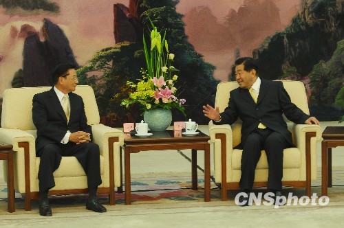 10月28日下午,中共中央政治局常委、全国政协主席贾庆林在北京人民大会堂会见台湾海基会董事长江丙坤率领的海基会新闻交流团一行。中新社发 侯宇 摄