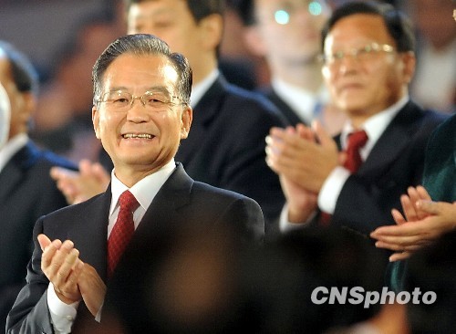 10月28日晚,第十一届全国运动会在山东济南闭幕,中共中央政治局常委、国务院总理温家宝出席闭幕式。中新社发 陈文 摄