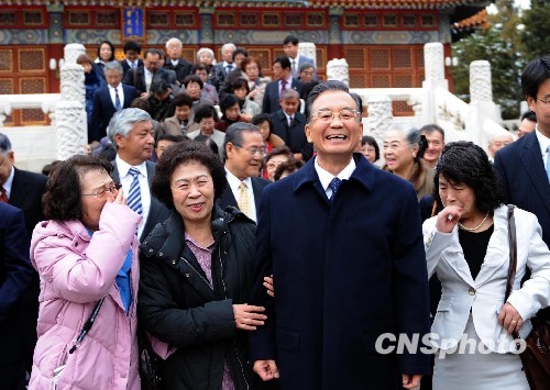 11月11日,温家宝和百感交集的日本遗孤走出中南海紫光阁。当日,中国国务院总理温家宝在北京中南海紫光阁会见了由野田毅、池田澄江率领的“日本遗孤感谢中国人民养育之恩访华团”。中新社发 廖攀 摄