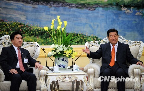 11月16日,全国政协主席贾庆林在北京人民大会堂会见了以高敬德为团长的中国和平统一促进会香港总会北京访问团一行。中新社发 廖攀 摄