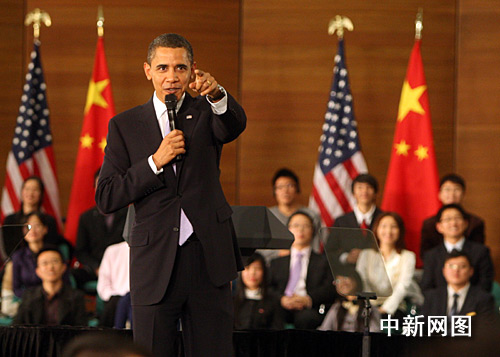 11月16日,美国总统奥巴马在上海科技馆与中国青年对话。 中新社记者 汤彦俊 摄
