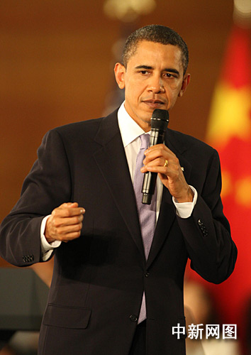 11月16日,美国总统奥巴马在上海科技馆与中国青年对话。 中新社记者 汤彦俊 摄