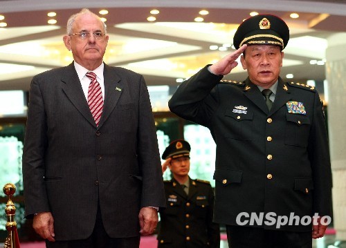 中国国务委员兼国防部长梁光烈上将,16日下午在北京八一大楼与巴西国防部长内尔松·阿泽维多·若宾举行会谈。若宾一行是应梁光烈邀请于11月14日抵达北京,对中国进行为期5天的正式友好访问。图为会谈前梁光烈陪同若宾检阅解放军三军仪仗队。中新社发 宋吉河 摄