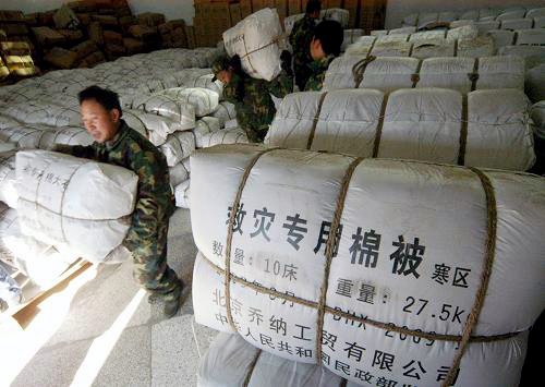 11月17日,在河北邢台救灾物资储备仓库,工作人员搬运雪灾救灾物资。民政部从中央救灾物资天津储备库向河北省调运的1万床棉被和1万件棉大衣于11月16日下午抵达石家庄南货场。河北省民政厅救灾捐赠中心连夜将物资分发至受暴雪影响严重的石家庄、邢台、邯郸、衡水、张家口等市,救助受灾群众。(黄涛 摄)