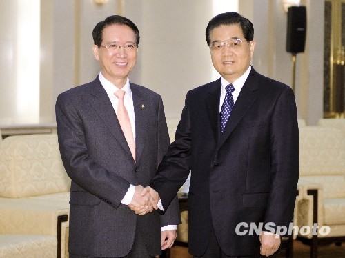 11月20日,中国国家主席胡锦涛在北京人民大会堂会见了由韩国国会议长金炯旿率领的韩国国会代表团一行。中新社发 廖攀 摄