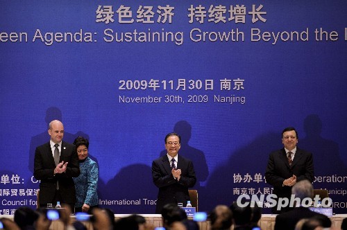 11月30日,中国国务院总理温家宝与欧盟轮值主席国瑞典首相赖因费尔特、欧盟委员会主席巴罗佐出席在南京举行的第五届中欧工商峰会。当日,第十二次中欧领导人峰会在南京金陵会议中心举行。中新社发 廖攀 摄