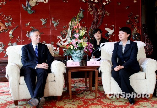 12月3日中午,扬州市委书记王燕文在迎宾馆会见了美国驻华大使洪博培夫妇和中国女儿杨乐意,美国驻上海总领事康碧翠会见时在座。当日,洪博培大使夫妇带着中国女儿杨乐意回到出生地江苏扬州寻根。中新社发 崔佳明 摄