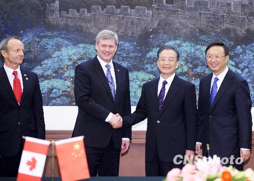 12月3日,中国国务院总理温家宝与加拿大总理哈珀出席中加双边相关协议签字仪式。中新社发 廖攀 摄