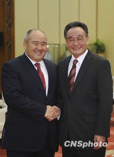 12月4日,中国全国人大常委会委员长吴邦国在北京人民大会堂会见了哈萨克斯坦第一副总理舒克耶夫。中新社发 廖攀 摄