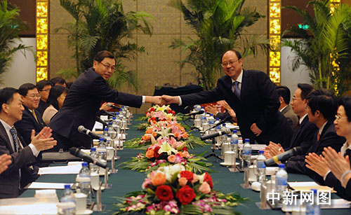12月10日上午9时,大陆海协会常务副会长郑立中、台湾海基会副董事长兼秘书长高孔廉分别率团参加“两会”第四次副会长级预备性磋商,主要为第四次“陈江会”做相关安排。图为大陆海协会常务副会长郑立中与台湾海基会副董事长兼秘书长高孔廉在磋商前握手。中新社发 刘可耕 摄