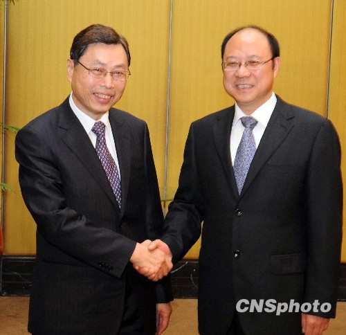 12月10日上午,大陆海协会常务副会长郑立中(右)与台湾海基会副董事长兼秘书长高孔廉(左)在福州参加“两会”第四次副会长级预备性磋商前握手。当日,“两会”第四次副会长级预备性磋商在福州举行,主要为第四次“陈江会”做相关安排。中新社发 刘可耕 摄