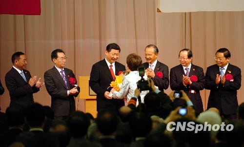 12月15日中午,正在日本进行正式访问的中国国家副主席习近平出席了由日中友好七团体和侨界四团体联合主办的欢迎宴会。图为日本著名歌手芹洋子代表与会者为其献花。芹洋子是日本歌曲《四季歌》的首唱者。上月,她曾与来日演出的习近平夫人彭丽媛同台演唱这支歌曲。中新社发 朱沿华 摄