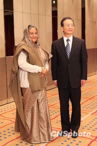 当地时间十二月十七日中午,在丹麦参加哥本哈根气候变化会议的中国国务院总理温家宝会见孟加拉国总理哈西娜。中新社发 余湛奕 摄