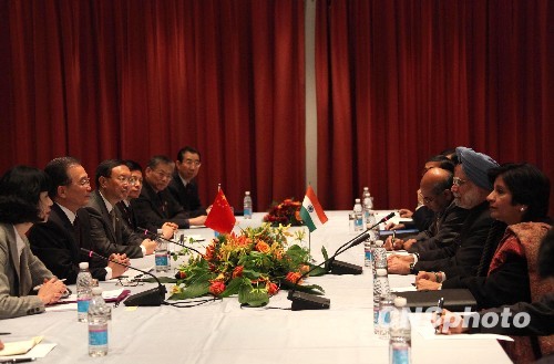 当地时间按十二月十八日上午,在丹麦出席哥本哈根气候变化会议的中国国务院总理温家宝会见了印度总理辛格。温家宝在会见时表示希望印度、巴西、南非和发展中国家加强团结和协作。中新社发 余湛奕 摄