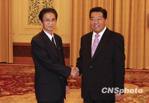 12月18日,中共中央政治局常委、全国政协主席贾庆林在北京人民大会堂会见了以书记局局长金完洙为团长的朝鲜祖国战线代表团。中新社发 盛佳鹏 摄