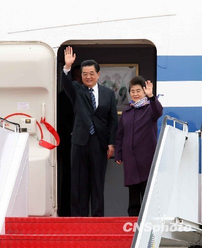 十二月十九日,中共中央总书记、国家主席、中央军委主席胡锦涛抵达澳门,出席澳门回归祖国十周年庆祝大会及澳门特区第三届政府就职典礼。图为胡锦涛主席步出机舱向欢迎的各界人士挥手致意。中新社发 洪少葵 摄