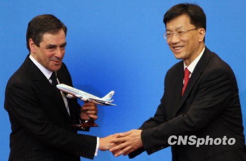 12月22日上午,在中国访问的法国总理菲永到北京航空航天大学发表演讲并回答学生提问后,北京航空航天大学校长怀进鹏向菲永总理赠送该校学生制作的“中国大飞机”模型。中新社发 任晨鸣 摄