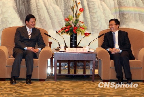 12月28日晚,上海市市长韩正(右)在上海兴国宾馆会见到访的台北县县长周锡玮(左)一行。中新社发 汤彦俊 摄