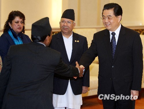12月30日下午,中国国家主席胡锦涛在北京人民大会堂会见尼泊尔总理马达夫·库马尔·尼帕尔(右二)、副总理兼外交部长苏加塔·柯伊拉腊(左一)等尼泊尔客人。中新社发 任晨鸣 摄