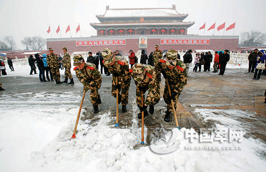2010年首场大雪给京城铺上了厚厚的雪被。1月3日,武警北京总队官兵走上街头清扫积雪,疏导交通。这是官兵们正在清扫天安门广场积雪的情景。李光印 摄