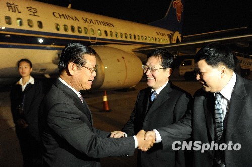 老挝副总理宋沙瓦·凌沙瓦一行一月五日晚飞抵南宁,出席将于七日在此间开幕的中国—东盟自贸区论坛。宋沙瓦·凌沙瓦一行在机场受到了当地官员的热烈欢迎。中新社发 蒋雪林 摄