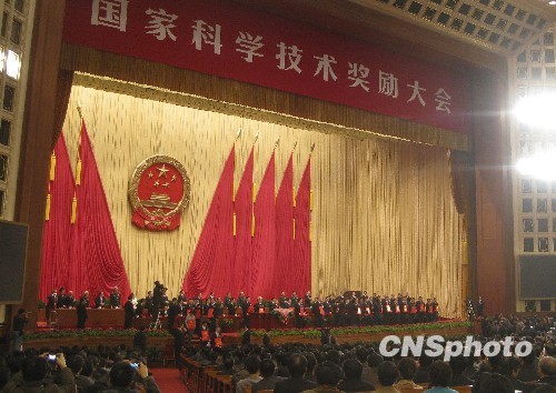 1月11日上午,中共中央、国务院在北京隆重举行国家科学技术奖励大会,党和国家领导人胡锦涛、温家宝、李长春、习近平、李克强出席大会。中国科学院院士、知名数学家谷超豪和中科院院士、“两弹一星”元勋、资深航天专家孙家栋荣获2009年度国家最高科学技术奖。 中新社发 孙自法 摄
