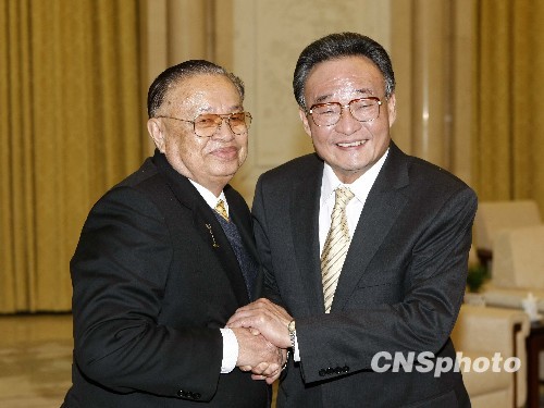 1月11日,全国人大常委会委员长吴邦国在北京人民大会堂会见了泰国国会主席兼下议院议长猜·奇触率领的泰国国会代表团。中新社发 盛佳鹏 摄
