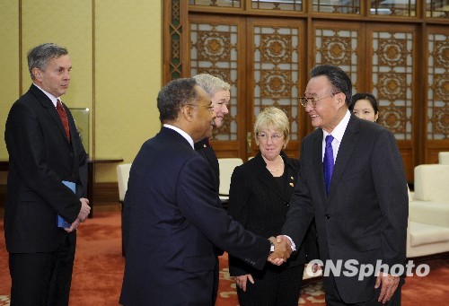 1月13日,中国全国人大常委会委员长吴邦国在北京人民大会堂会见了美国国会参议院代表团一行。中新社发 廖攀 摄